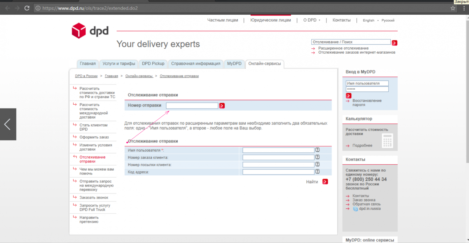 Шаг 4. Заполните необходимые поля, введите Ваш трек-номер в поле, указанное на скриншоте и нажмите на кнопку «Найти»